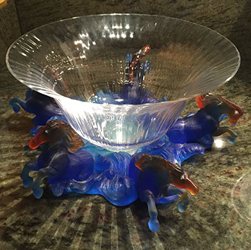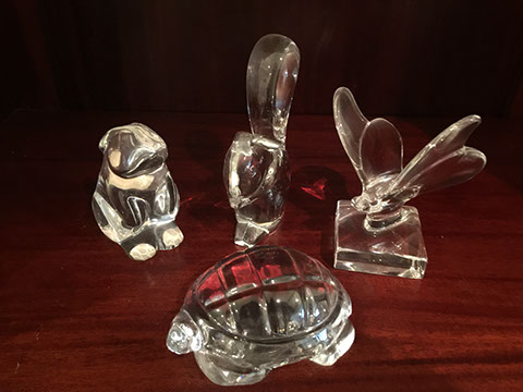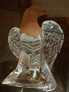 Large and important pieces of Lalique:“Luxembourg” bowl, “Chrysalide” vase, “Mossi” vase, “Ingor” caviar server, “Lion Family” figures, Scarce “Tigres” vase, “Chrysis” hood ornament, “Cote d’Or 150th anniversary platter, Turtle with amber colored shell, “Copellia” covered trinket box; Baccarat: “Aphrodite” figure, Decanter with gilt decoration, “Diva” vase, “Architectural” vase, Eagle figure; Daum: Eagle figure with amber colored head, “Marly” bowl; Steuben: acid cut green table lamp, Eagle figure on an orb, Otter figure; American Brilliant Cut Glass; Mary Gregory; M. Missary Paris Moroccan tea shot glasses; Lobmeyr steins; Chinese Peking vases; “Aphrodite” figure, Heisey etched goblets and plates.