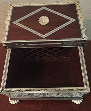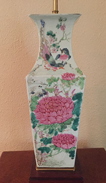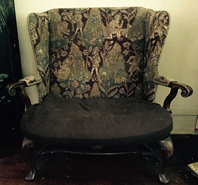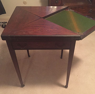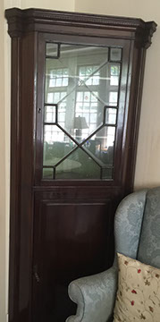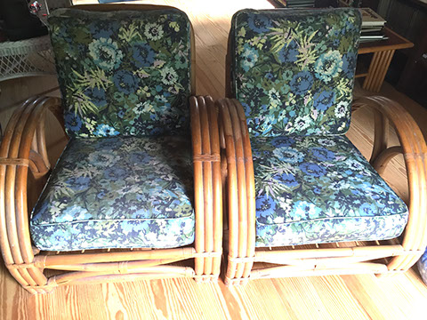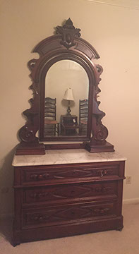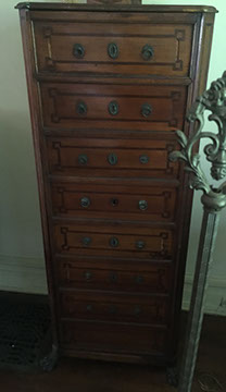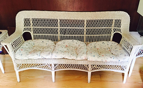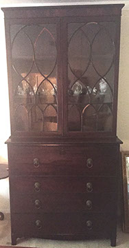 Antique English mahogany eight-drawer highboy on Queen Anne legs, batwing pulls; Victorian music cabinet with 22 drawers behind solid cabinet door; Antique upholstered settle on cabriole legs, Empire mahogany drop-front secretary desk on bracket feet; Mid-Century Modern rattan and bamboo furniture- chairs, tables and sofa; Vintage wicker furniture: settee, chaise longue, end tables; Leather topped library table; Antique Scottish tall clock with brass face; Pair of matching English mahogany fern stands; English mahogany corner cabinet; English slant front mahogany desk; Gold leaf mirrors; American mantel/shelf clock with original glass door; Two English two-door mahogany armoires; Empire upholstered sofa; Sheraton style sofa with single bench cushion; American period side chairs with rush seats; Victorian marble top dresser with mirror and candle stands, three drawers; English mahogany four drawer slant front desk on bracket feet; English mahogany Empire chest of drawers with seven drawers; English Sheraton three drawer slant front desk; Antique American walnut cradle; Unusual Victorian vanity with three oval folding mirrors.