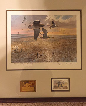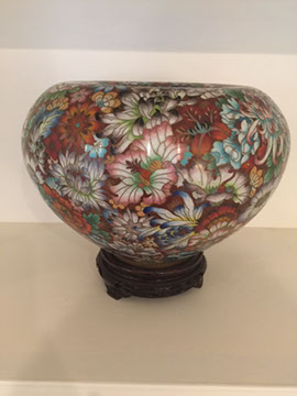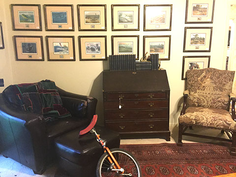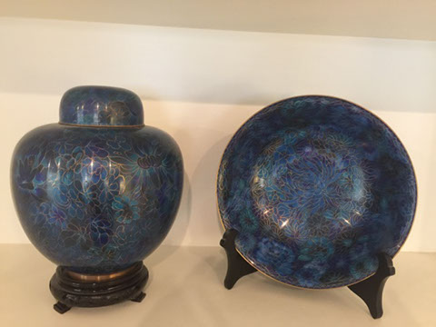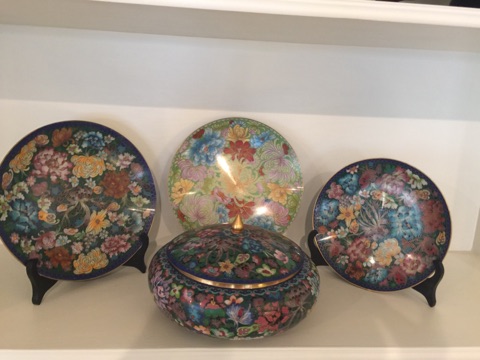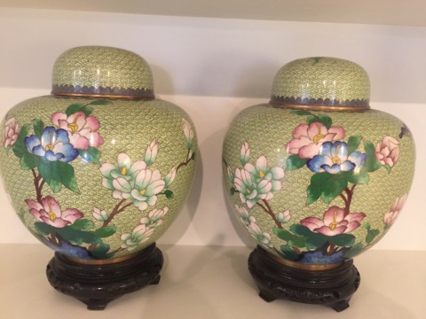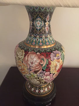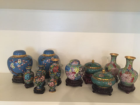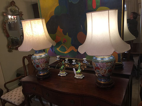 Baccarat champagne goblets, highball glasses, and old fashioneds; Men’s hunting accessories: duck and goose calls, pocket and hunting knives; Collection of small to mid-size music boxes; Vintage loisonné from 1950s-1960s; Rare Twenty-inch Amethyst Geode. Mid-century Modern Dunbar desk; Two banquet tables;