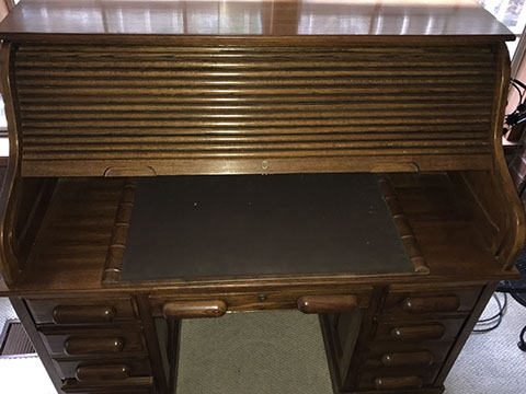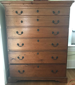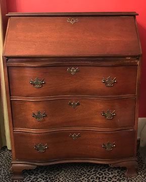 Period antique American & English furniture: Set of 8 Sheraton style oval backed dining chairs;  Oval Victorian marquetry inlaid burled walnut "loo" table; 19thcentury style mahogany game table with swivel scallop top, inlaid bell flowers and spade foot; Early 19thC Hepplewhite pole screen with painted designs; Rare gentlemen’s corner chair with detailed carved splats, c1790; George III walnut oyster veneer 5 drawer chest, c1820; Burl walnut drop leaf table; Highly carved Ladies folding chair, late 19thC; Herter Brothers American Empire table; Pair inlaid 4 drawer small side chests; Antique Victorian walnut cylinder roll secretary desk; Edwardian coal scuttle; Highly carved Fine Renaissance style hall chair; French inlay etagere