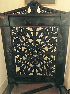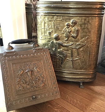 Copper & Brass: Large copper coal bucket with brass trim & Delft handle; Brass fan shaped folding fire screen;