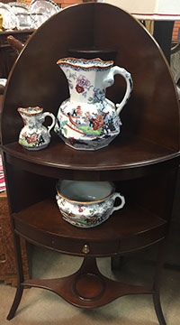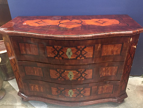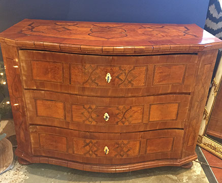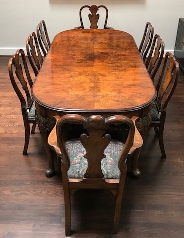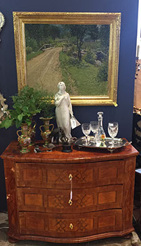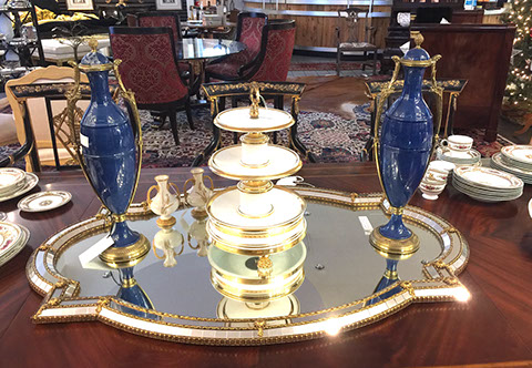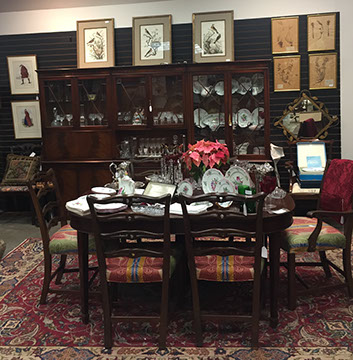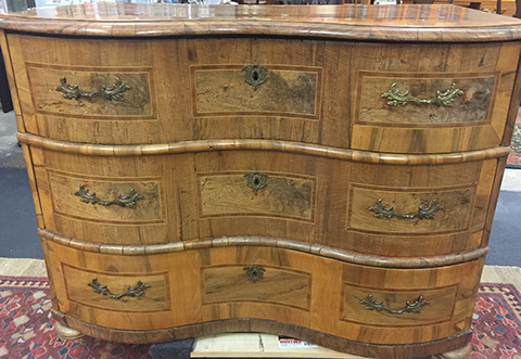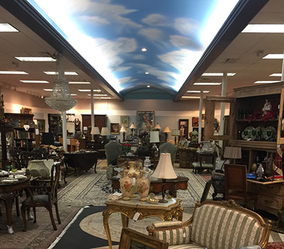 American, English and French antique furniture; Country French buffets and sideboard; French Victorian display cabinets; Antique English Queen Anne burl wood dining table with original crank and accompanying set of 8 chairs; Louis XVI Period day bed; Louis XV style desk with bronze dore and inlay; English sideboard; French three drawer walnut and cherry serpentine chest with inlay; Bow front three drawer chest in mahogany with inlay; Bow front three drawer chest with inlay and brass hardware; Fine Normandie French armoire; Country French armoires; Country French chaise longue with down cushions; Antique English breakfronts; Pace Collection style glass dining table and coffee table; Painted Chinoiserie red and black gilt lighted display cabinet; Danish and Norwegian Mid-Century Modern; Biedemeier style chairs and tables; Baby Grand pianos: Whitney and Harwood; Steinway upright piano; Selection of English antique bookcases; White silk upholstered Empire style Recamier; Stamped leather Empire style daybed; Polished wood Empire style daybed; Sligh 100th Anniversary Nine Tube Tall clock; Pair of Jacometti style leather sling seat benches; Antique cradle; English drop leaf tables; English bookstands; Painted furniture; Brass and glass coffee tables; Empire style secretary; Coromandel lacquered screens; French marble topped table; Baker’s racks; Fireplace screens; Victorian settee; Bar stools; Wall Clocks; French Empire clock; Chinese tablet tables; John Widdicomb Mid-Century Modern furniture; Antique Danish slant front desk; Oriental trunks; Steel king size bed; Painted wood king size bed