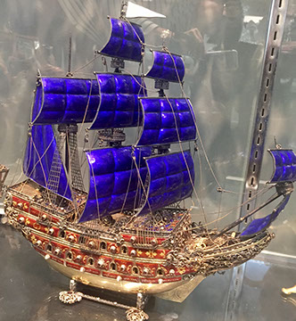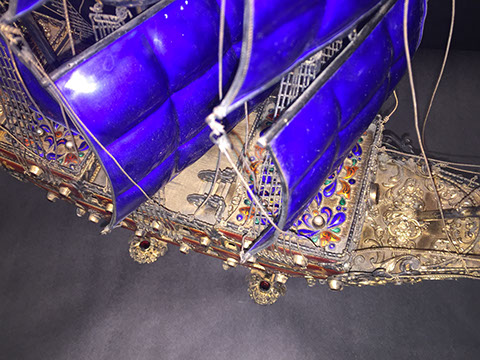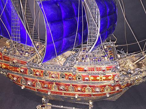 Important hand crafted fanciful Three Masted Galleon with French cobalt enamel sails, silver hull, sides enameled in red with bronze dore scrolls, all