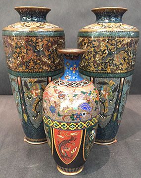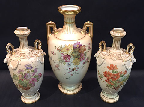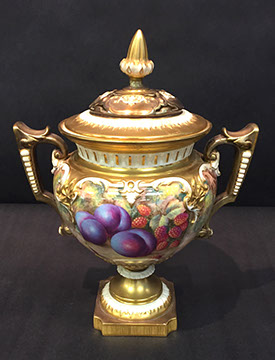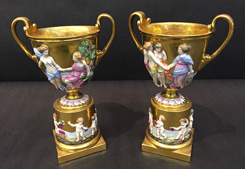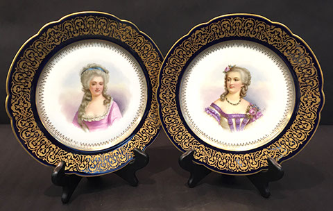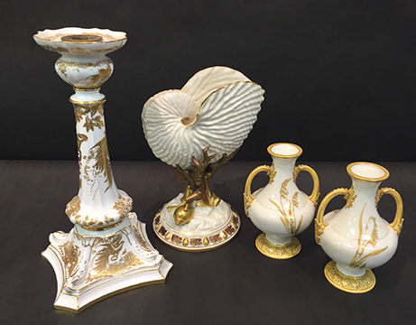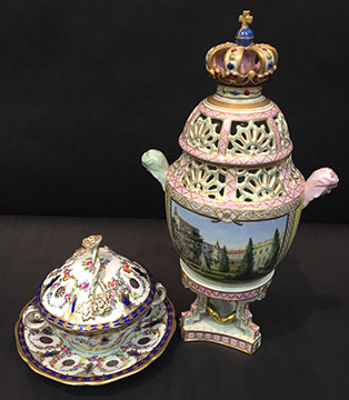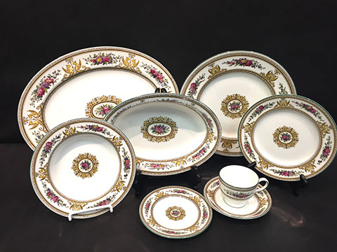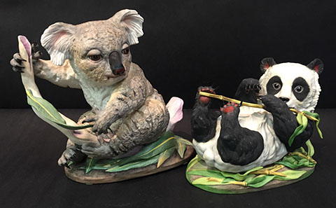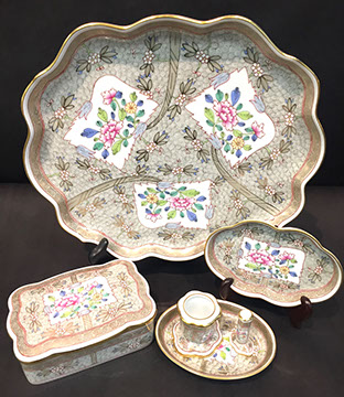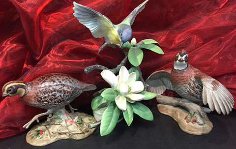 Old Paris “Empire”; Large and small pieces of Herend: chocolate pot, dresser set, pair of Foo dogs; Wedgwood “Columbia” fine china; Franciscan; Tiffany Private Stock Camille Le Tallec “Black Shoulder”; Royal Bonn; Portuguese Faience; Spode; Luneville “Old Strasbourg”; signed Limoges oyster plates; Mason’s Ironstone; Mexican Talavera; Royal Worcester, Boehm animals & flowers, Staffordshire, Lladro, Belleek; Old, signed Capodimonte figurines; Moorcroft pottery; Royal Crown Derby; Delft; Lladro 32 pc. Chess Set; Two sets of 12 antique Minton plates; Coalport; Royal Worcester urns; Large set of “Desert Rose”, California pottery; Antique Dresden; Antique Schumann; French bisque figurines; Italian painted pottery bowl, signed “Desimone 1977”; Staffordshire; Flow Blue; Halcyon Days boxes; Limoges trinket boxes; Royal Doulton figurines; Chinese and Japanese Champleve; RS Prussia red seal; Carved coral and soapstone figurines