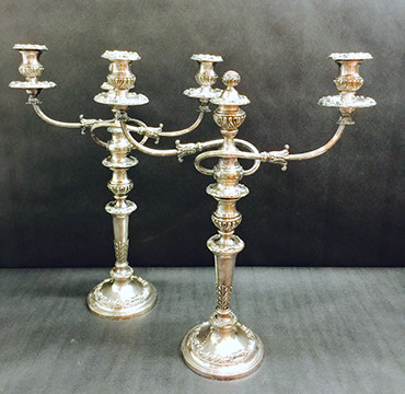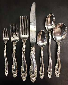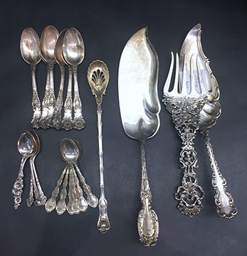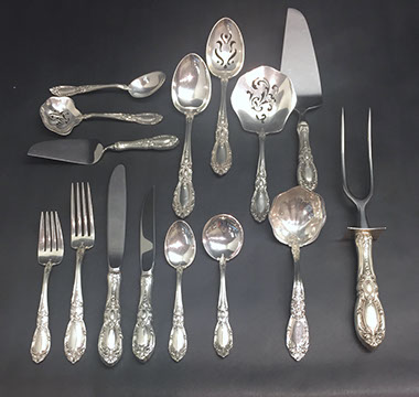 Sterling flatware: Towle “King Richard” sterling flatware; Gorham Sterling coffee service; Tiffany Sterling 7” plates; Gorham Sterling Pitcher; Kirk & Sons Hollowware; Collection of Gorham serving pieces; Antique napkin rings; “Prelude” by International flatware; Hertzberg Jewelry sterling flatware; Sterling candelabra; Collection of antique sterling serving pieces; Sterling overlay seashells by Scully & Scully