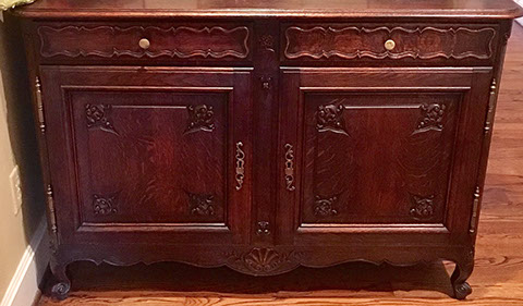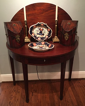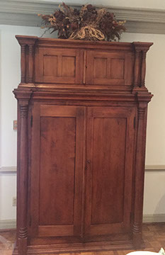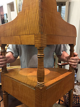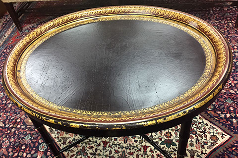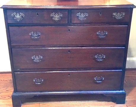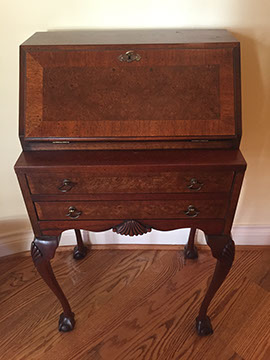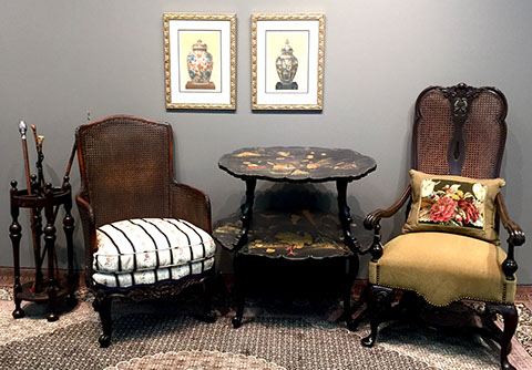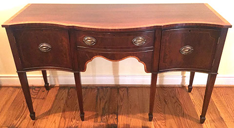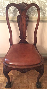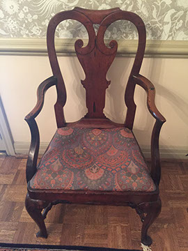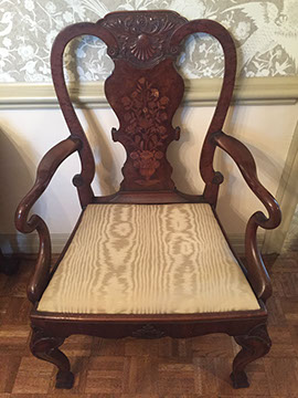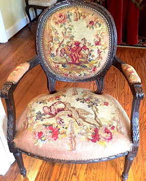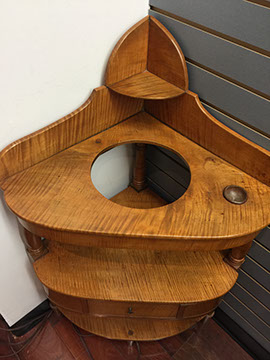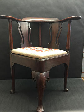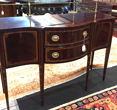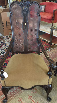 American, English and French antique furniture; Period American furniture: Mahogany Pembroke table with one drawer, c.1790-1810; Walnut and pine glass door cupboard, c.1870-1880; Windsor Armchair, Mahogany and inlay card table, Massachusetts c.1790-1810; Two piece wardrobe in tulip poplar, Ohio c.1830-1840; Triangular washstand in tiger maple with three shelves and drawer, c. 1825-1840; Drop-leaf table with single drawer, c. 1840-1850; Mahogany four drawer bow front chest of drawers, c. 1800; Gilded wood looking glass with central cherub & eagle flanked by birds on trees, c. 1810; Pair of shield back mahogany chairs, probably Maryland, c.1800; Period English furniture: Mahogany three section dining table on three urn pedestals, late 19th century; Papier mache tray table, on wood base, c. 1820-1850; Mahogany and veneer on pine bow-front sideboard, c. 1780-1800; Walnut looking glass in two parts with molded frame,c. 1720-1740; Brass fender, steel & iron, c. 1800-1820; Wing back chair; Corner chair with needlepoint seat, c. 1750-1770; Walnut Queen Anne style arm chair, c. 1740; Queen Anne style side chairs with original leather seats; French Biedemeier style daybed with inlay; Country French table & matching chairs, Armoires, Sideboard; Mid-Century Modern furniture; Chinese Oriental furniture; High Victorian Eastlake table, Chest with marble top and matching mirror; Brass Andirons; Canopied four poster bed; French Buffet Tables; English Oak Step back Welch Dresser; Game table with inlay, plaques and bronze accents; English Tall Clocks; Multiple Formal Dining Tables; Sets of Chinese and Queen Anne dining chairs; Mahogany sideboards; Needlepoint Berger Chairs; Lap desks; Zero Modern “Delfin” dining chairs; Empire daybed with inlay; Italian Louis Ghost chair by Kartell, design by Starck; Black Japanned furniture; Chinese Canton furniture; Leather Milo Baughman style tub chairs; Wingback chairs; Leather tufted ottoman; Coromandel screen; Antique framed German birth certificate; Antique framed sampler, dated 1828; Camelback & Sheridan style sofas; Six woven rattan dining side chairs; Painted headboards; Pair of Ebonied wall sconces; Garden furniture
