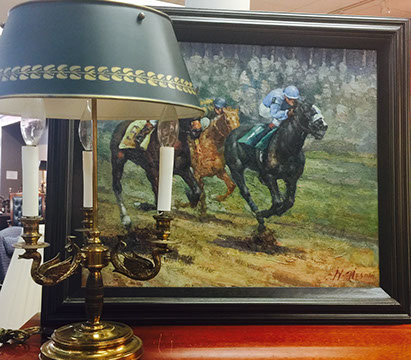 Original American & European Oil Paintings; Period American & English Furniture curated by Barry Greenlaw, Appraiser, Texas; Tiffany & Co. Platinum & diamond solitaire ring, square mixed cut diamond marked “c. 1999 TIFFANY & CO., approximately 5.10 carats (Not on premises, by appointment only), GIA certified w/ original papers; Superb collection of Judith Lieber Minaudieres; Pre-Colombian artifacts; Verre eglomise dressing table; Collection of papier mache boxes; Tole ware; Document Boxes; Miniature children’s upholstered settee, and chair and chest; Collection of Vintage German Turkey candy boxes; Wrought Iron Gazebo (15’x11’); Handmade Oriental Rugs; Pair of Royal Copenhagen artist-signed lamps; Theorem painting, American c. 1840, painted scene on velvet; Collection of Staffordshire portrait figures from the Victorian Era; Map of North America “North America with the West Indies”; Vintage hand-blown, non-lead crystal Crachoirs; Diminutive children’s furniture; Country French carved, cane seat chair; Set of 8 antique French painted, caned chairs; Antique lorgnette glasses; Pink Venetian glass chandelier; Limited Ed. Theo Faberge Egg, crystal with enameled painting in gold gilt panels; Antique French cabinet with marble top; Antique Flax Wheel; Antique decorative pillows; Antique needlepoint tapestry; Snuff bottles; Wedding handkerchiefs; Beaded Indian Tapestry; Native American jewelry; Dolls; Collection of Mme. Alexander dolls, French Santons; English library; Radko Christmas ornaments; Russian Santa’s; Jay Strongwater boxes; American Artist pottery; Collection of canes and holder; English bamboo furniture; Garden furniture