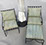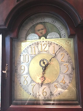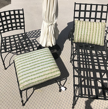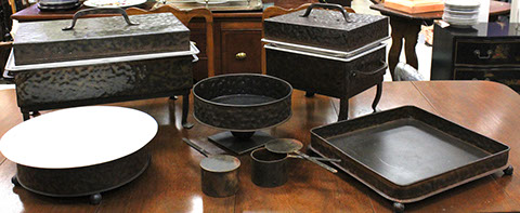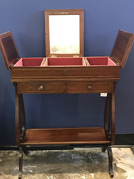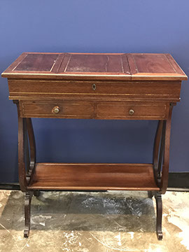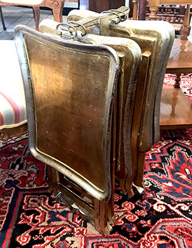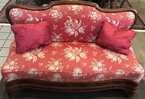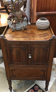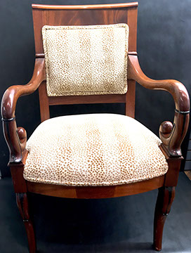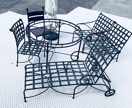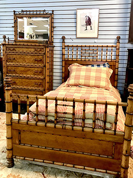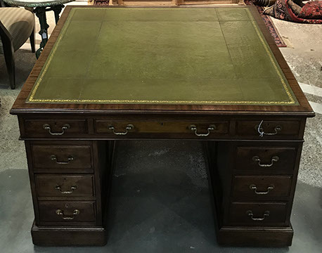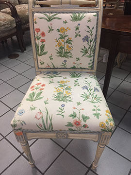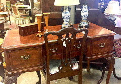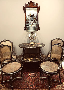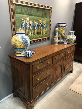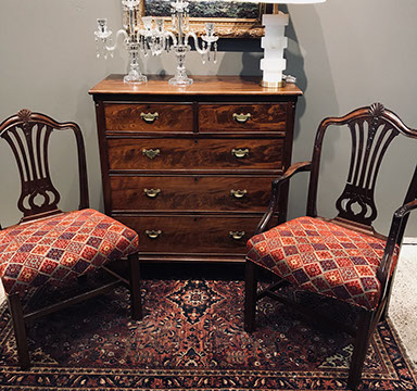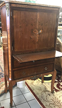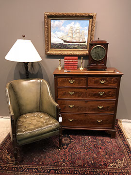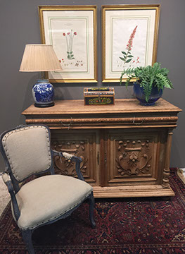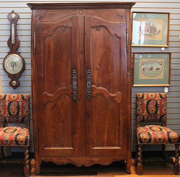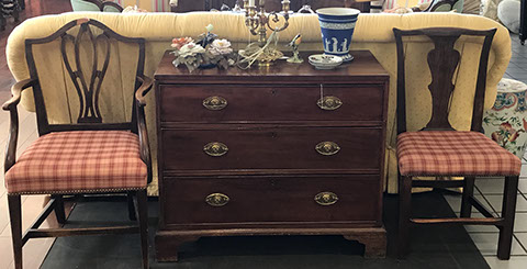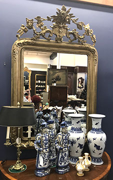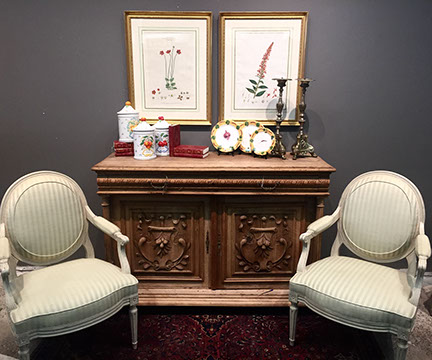 American, English and French antique furniture; Period American & English furniture: American Period sofa, c. 1825; English calendar tall clock with original brass dial by R. Jackson, Hexam, early 18C; 12 Panel Coromandel Screen, 10’ high; English mahogany cased barometer by Channe, Regency 1800-1830; English oak chest on chest with bracket feet, c.1820; Period dining chairs; Set of 16 English dining chairs, 2 arm & 14 side; English Oak Queen Anne drop leaf table c. 1740-1760; Petite lyre form mahogany dressing table; French oak linen press, 19th C; French 18th C Baroque pine and oak wedding armoire with molded cornice and doors decorated with musical medallions & floral trim; Mahogany & fruitwood Secretaire, late 18thC with gold & grey marble top on cabriole legs; Jacobean style dining table; Pair of antique 19thC French display tables; Pair of 19thC Louis XVI Neoclassical gold leaf side chairs; French late 18thC Neoclassical fruitwood & mahogany bibliotheque with 3 partial screened glass doors and patterned marquetry; English Centennial dining room tables & chairs; English square open bookshelves with slant top lectern; English Sideboards; Country French Sideboards; Demi-lune chests; Antique corner hanging cabinets; Barley twist bookshelves; Baker secretary from the Heritage Series; Small inlaid Bombay chest with 2 drawers; Pair of caned seat & black lacquered chairs; Mid-Century Modern & Contemporary furniture; Modern Farmhouse painted furniture; Mark Hampton designed upholstered furniture and headboards; Brown Jordan garden furniture; Vintage Victorian wrought iron garden furniture; Sets of Bergere arm chairs; Contemporary furniture; Blue painted set of French Bergere arm chairs; Pewter & marble topped console table; Oval shaped brass & granite topped coffee table; Coffee tables: oval brass & glass, glass, brass, wrought iron, painted wood, inlaid