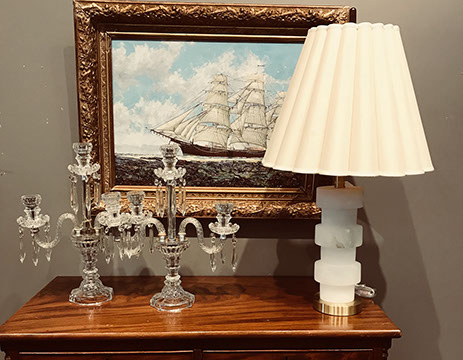 Chandeliers: Crystal, Brass, Pewter, Architectural wooden; Period Looking Glasses; Towle sconces & lanterns; Lamps: Imari; Old Paris; Mottahedeh , Tobacco leaf, Bouillotte , Acrylic, Porcelain lamps, Bronze & Brass lamps; Hand carved wooden table & Barley Twist standing lamps; Pair of pewter 6 branch chandeliers; Wall Sconces; Decorator & table top lamps; Gilt Regency style mirrors; French Empire style mirror; Chippendale style gilt mirror; Tramp art mirror; Gold Leaf Pier Mirror; Victorian Gold leaf mirrors;