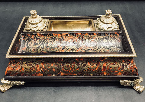 17th Century Belgian Gothic tapestry depicting the Four Seasons, after the painting by Charles Le Brun; Coromandel 10’ high, 12 panel screen; German Bracket Clock; Tiffany Tall Clock with 3 weights; Early American hooked figural rug, 18th Century; Three cushion tuxedo sofa covered in green velvet Scalamandre; Library stand on wheels; English calendar tall clock with original brass dial by R. Jackson, Hexam, early 18C; English mahogany cased barometer by Channe, Regency 1800-1830; Versace, Porthault, Pratisi & E. Braun fine table & lap linens; Jan Barboglio six piece buffet servers; Civil War Era “Hat” bathtub; Marbleized Papiro desk sets; 12 sets of long, Mark Hampton designed draperies in the finest of fabrics; Faux bamboo twin bed set with matching bamboo chest & mirror, signed; Faux bamboo shelves; Collection of Antique Inkwells; Collection of Antique doorstops; Tea boxes, Brass candlesticks; Garden statuary; Antique Carnival hammer; Antique Whimsical Bronze standing lamp with Rooster foot & Salamander base; Brown Jordan patio & poolside furniture; Vintage Victorian style wrought iron patio furniture; Garden Statuary; Turned wood hat pin holders; Leather bound books; English Tantalus with 3 matching ABC bottles with all original brasses; English Mahogany tea caddy, inlaid with maple; Thai Spirit House; Red Graniteware; Vast array of Tabletop Event & Entertaining sets, dishes, utensils; Selection of Folk Art Santas, Nativity scenes; Chanel Sunglasses; Sailors' Valentines;